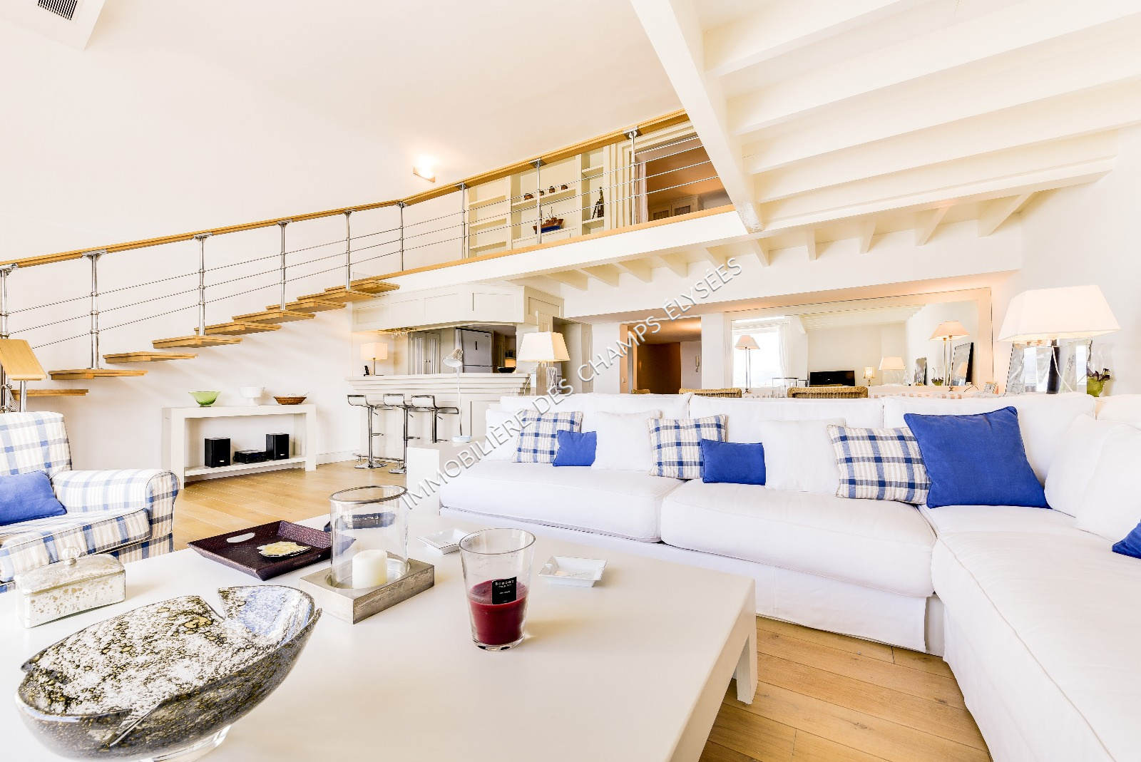 Exceptionnel par la présence d’une immense baie vitrée donnant sur le Port et sur la mer qui nous donne l’impression d’être sur une terrasse depuis le séjour, la salle à manger et son bar cuisine entièrement équipé.