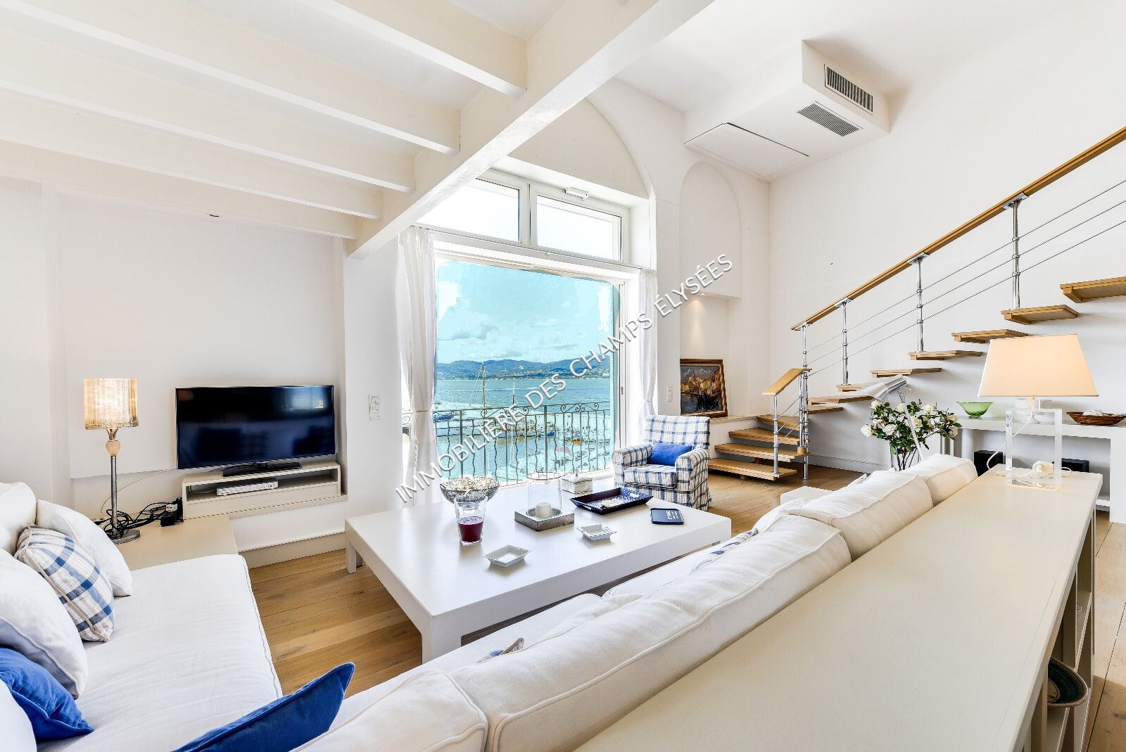 La spectaculaire fenêtre donnant sur le port est le centre de gravité d'unehabitation de style « total white » meublée d'une élégante sobriété, sous le signe du soleil méditerranéen.